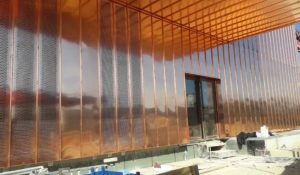 -Brise soleil en tube habillé de cuivre perforée.
