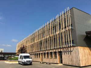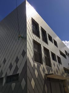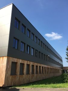 -Bardage cassette isolé(1463m²) : Lame Aluminium BLADE SIDING Finition AluNatur PUR-PA Elox Umber Brusched sur ossature bois.